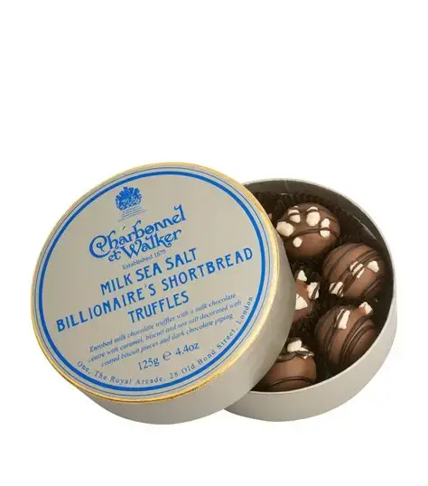 Milk Sea Salt Billionaire Shortbread Truffles by Charbonnel et Walker are mouth-wateringly delicious sea salt caramel and biscuit centre truffles enrobed in milk chocolate and decorated with biscuits pieces and dark chocolate piping packed in a luxury round gift box.
