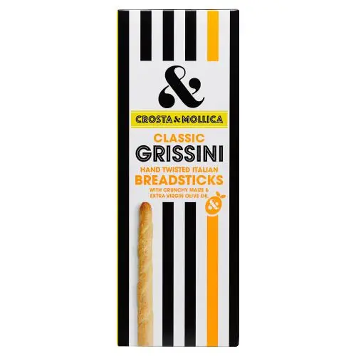 Crosta & Mollica Grissini are the classic Italian pre-dinner snack. Hand twisted, they are prepared with a dash of extra virgin olive oil for authentic Mediterranean flavours.